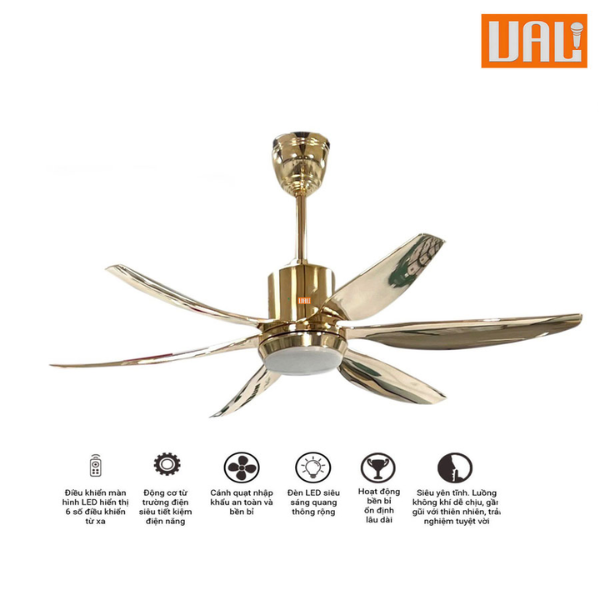 Quạt Trần UAL-601-VBMB vàng bóng ABS không chỉ mang lại luồng gió mát mẻ mà còn giúp tạo ra không gian sống thoáng mát và gần gũi với thiên nhiên. Đặc biệt, quạt có khả năng tạo ra luồng gió nhẹ nhàng, không gây khô da hay khó chịu, rất phù hợp cho gia đình có trẻ nhỏ và người lớn tuổi.